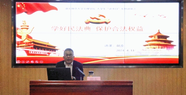 本网讯(通讯员 李湘湘 史秋蕊)为强化大学生对《民法典》的认知和理解,增强同学们运用《民法典》维护自身权益的意识和能力,引导同学们养成尊法、学法、守法、用法的思维方式和行为习惯。4月11日下午两点半,爱体育体育(中国)官方在线在图书馆报告厅举办“湖山讲坛”第五讲——《民法与大学生生活》,本次活动由校党委宣传部、图书馆联合举办,100余名文理学子现场聆听。本期主讲嘉宾为湖北师范大学青马工程理论导师、湖北省基层理论宣讲员、黄石市委宣讲团成员胡泰教授。